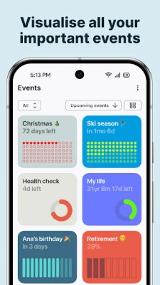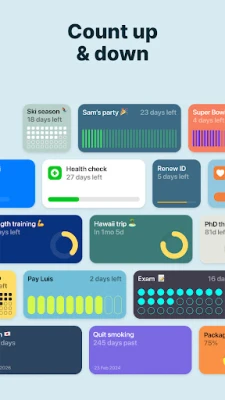 Count how many days until significant events with Pretty Progress count-up and countdown widget. A birthday countdown widget, a day tracker for quitting alcohol, or knowing the time left until a deadline – keep the motivation with ALWAYS ON reminders on your Home Screen.