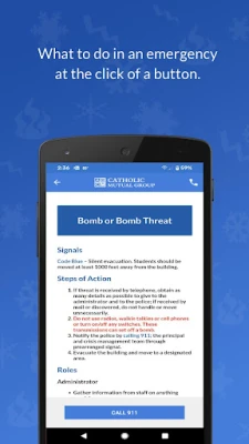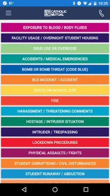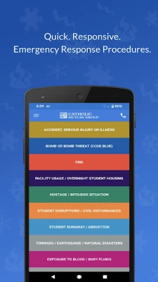 Catholic Mutual Group brings you a new Emergency Response Procedure (ERP) application for parishes, schools, and other religious institutions. This easy-to-use application offers step-by-step directions to guide you through numerous emergency situations from your mobile device. Guidelines on responding to medical emergencies, severe weather, and armed intruders are just a few of the convenient best practices available on this new application. There is also a ‘quick-call’ feature to contact emergency personnel or applicable contacts during an emergency. Utilizing the ERP application gives clear and practical information in the event of an emergency situation.